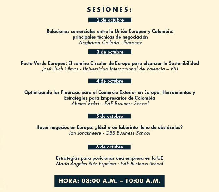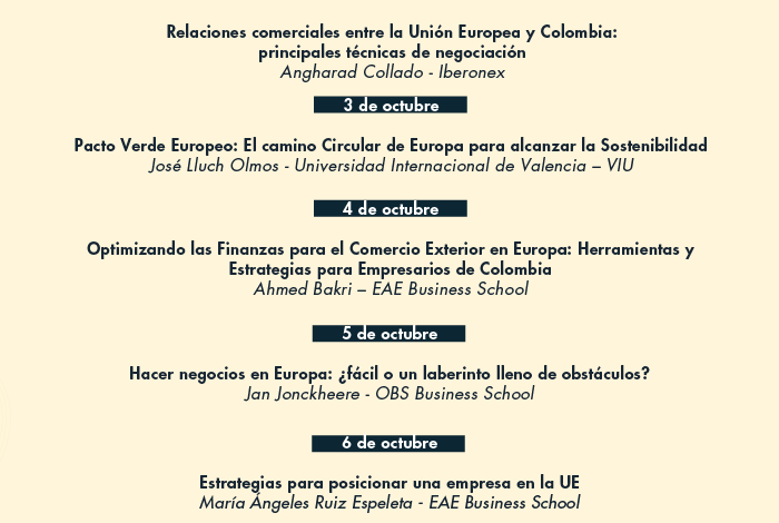 Como preludio a este evento, del 2 al 6 de octubre se llevará a cabo un Workshop de Internacionalización para el Mercado Europeo, organizado por el Ministerio de Comercio, Industria y Turismo a través de ProColombia y Planeta Formación y Universidades. Este espacio virtual de formación proporcionará a las empresas colombianas participantes información valiosa sobre cómo llevar a cabo negociaciones efectivas con compradores europeos.